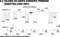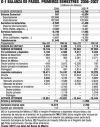 Por su parte, la balanza de servicios no factoriales (turismo, fletes, seguros...) redujo ligeramente su déficit (-2 mil 456 millones de dólares) en este semestre respecto de su equivalente de 2006. Asímismo, la balanza de servicios factoriales (pagos al capital por intereses, utilidades, regalías...) arrojó un déficit de -7 mil 985 millones, ligeramente inferior al registrado un año antes (Gráfico 1).
