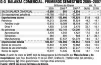 El deterioro de esta cuenta se corresponde casi en su totalidad con el deterioro registrado en la Balanza Comercial (intercambio de mercancías) que a su vez pasó de un superávit en 2006 de 581 millones a un déficit en 2007 de -5 mil 034 millones. Sin las exportaciones petroleras, este déficit comercial habría llegado a -23 mil 658 millones en el semestre (Gráfico 3).