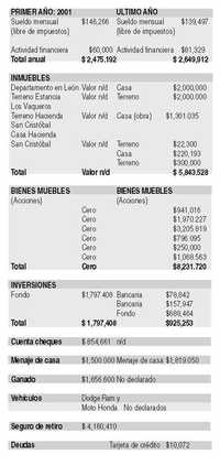 La ley de responsabilidades impone a los funcionarios que concluyen su encargo la obligación de declarar su patrimonio. Es información secreta, a menos que el funcionario quiera hacerla pública. El ex presidente Fox ofreció en su campaña que daría a conocer sus bienes al entrar y al salir del gobierno. En efecto, recién se instaló en Los Pinos, el 30 de enero de 2001 –todavía era soltero–, rodeado de cámaras de televisión reveló el monto de su patrimonio. No llegaba con una mano atrás y otra adelante, había sido gobernador de Guanajuato. Seis años después, sin acompañamiento televisivo, el 29 de enero de este año presentó la declaración de su último año de gobierno. No es secreta, puede consultarse en la Secretaría de la Función Pública. Obviamente, después de desempeñar el cargo mejor pagado del país su fortuna creció notoriamente. Antes de irse le dio el último pellizco al presupuesto: cobró su seguro de retiro del empleo que tuvo sólo seis años, por más de 4 millones de pesos, cifra inimaginable para cualquier empleado público o privado, aunque haya trabajado toda una vida. En la gráfica anexa pueden comparar su fortuna antes y después: