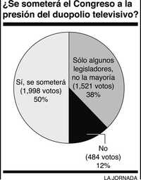 Mientras se libraba en el Congreso una histórica batalla para someter al duopolio televisivo a un nuevo marco constitucional, lanzamos una encuesta para pulsar el sentir de la opinión pública: ¿se someterá el Congreso al duopolio? Un dato importante para interpretar los resultados: iniciamos el sondeo el sábado anterior, cuando todavía no se conocía el resultado de la batalla. Las respuestas revelan la desconfianza en la actuación de legisladores que no siempre han estado del lado del interés nacional; 50 por ciento contestó que el Congreso ‘se someterá’; 38 por ciento dijo que ‘algunos legisladores se doblarán, pero no la mayoría’ y sólo 12 por ciento tenía una confianza plena en el Congreso y afirmó que ‘no se someterá’. Los hechos vinieron a darle la razón a los últimos dos grupos: ayer en la tarde la Cámara de Diputados avaló sin cambiar un solo punto la reforma electoral previamente aprobada por el Senado.