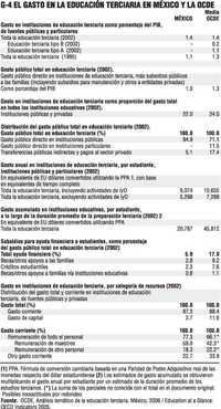 El gasto anual por estudiante en educación terciaria en todo tipo de instituciones (públicas y privadas) fue en 2002 de 6 mil 074 dólares en México contra 10 mil 655 dólares en el promedio de la OCDE (el equivalente en dólares está calculado usando la paridad de poder adquisitivo y no la paridad o tipo de cambio del mercado). Excluyendo las actividades de investigación y desarrollo (IyD) realizadas por las instituciones de educación terciaria, dicho gasto anual por estudiante baja a 5 mil 298 dólares en México y a 7 mil 299 en la OCDE.