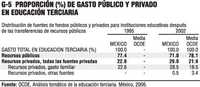 México gasta en total (datos de 2002) 1.4% de su PIB en educación terciaria, porcentaje igual al que en promedio realizan los países de la OCDE. De este porcentaje, sin embargo, en México sólo 1.1% del PIB es gasto público (0.3% es privado) mientras que en el promedio de la OCDE el gasto público es 1.3% y el privado únicamente 0.1% (Gráfico 4).