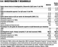 El gasto interno bruto en investigación y desarrollo científico-tecnológico representa en México (2001) apenas 0.39% del PIB, muy por abajo del 2.27% promedio de los países de la OCDE. De este gasto total, en México 0.12% del PIB lo realizan las instituciones de educación superior y en la OCDE, 0.40% (Gráfico 6).