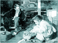 Los principales centros de producción artística en esos años fueron Madrid, Sevilla, Valencia, Cataluña y el País Vasco, y, aunque todas coincidieron en explorar la tradición y la renovación en la españolidad, cada escuela produjo un arte con características propias. El historiador y crítico de arte Francisco Calvo Serraller establece una división tajante entre las dos vertientes antagónicas de las corrientes pictóricas españolas finiseculares: la pintura “negra” y la “blanca”, polarización claramente representada por las dos grandes luminarias de la época, el vasco Francisco Zuloaga y el valenciano Joaquín Sorolla, a quienes el especialista describe de la siguiente manera: “El negro y el blanco, la enfermedad y la salud, la tragedia y la fiesta, lo hondo y lo superficial, lo feo y lo agradable.” Y es que la corriente “negra”, más afín a los artistas castellanos, se ocupa de captar ese lado oscuro de la sociedad que pone al descubierto la desigualdad social y los bajos fondos, a través del casticismo regionalista que encuentra su inspiración en imágenes de una España pobre y marginada, pero con gente digna que ostenta un aire de hidalguía, como lo plasman el propio Zuloaga, Eugenio Lucas Velásquez, Ramón Casas o Luis Graner Arrufi. La vertiente “blanca”, mayormente realizada en la región mediterránea –en particular en Sevilla, Valencia y Barcelona– recrea el aspecto “amable” del país, embelleciendo la realidad a través de paisajes naturales, escenas costumbristas de fiestas populares, labores y oficios, retratos de la burguesía y la sensualidad y candidez de la región levantina, magistralmente recreada por Sorolla, máximo creador del luminismo español, representado en esta muestra con dieciséis extraordinarias pinturas. Sus niños jugando en la arena y flotando en la superficie del mar son obras maestras del estudio de la luz, de las transparencias, y del desafío de las formas en movimiento bajo el efecto del agua. Estas escenas le proporcionaron desde sus inicios el prestigio internacional, sin embargo, sus obras tempranas de escenas intimistas de la realidad social provocan, a mi parecer, mayor emoción y sobrecogimiento, como es el caso de Los pimientos que se exhibe en esta muestra: una “negra” atmósfera en el interior de una barraca apenas iluminada por un haz de luz y el sutil reflejo de una hoguera prodigiosamente evocados con la precisión de unas fugaces pinceladas ondulantes.