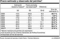 Ahora si se considera la estimación de 42.2 dólares por barril de petróleos que fijó el gobierno para 2007 y las tendencias reales del precio del crudo mexicano incluyendo las estimaciones para estos últimos tres meses de las principales corredurías nacionales e internacionales, el error de estimación llegaría a casi 38 por ciento.