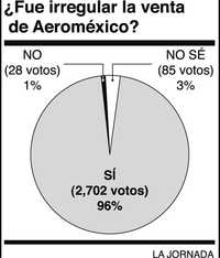 ¿La ganga de Aeroméxico fue el medio que empleó el presidente Felipe Calderón para gratificar a un grupo de empresarios que lo ayudaron a llegar a la Los Pinos? Noventa y seis por ciento de las 2 mil 815 personas a quienes planteamos la pregunta esta semana contestó que sí. Sólo uno por ciento piensa que la venta fue una operación transparente y 3 por ciento contestó “no sé”.