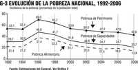 Pobreza de Patrimonio.- Ingreso menor al necesario para un consumo básico de alimentos, salud y educación, más vestido y calzado, transporte público y vivienda. En 1996 se encontraban en este nivel de pobreza 64 millones de personas (69% del total) y para 2006 únicamente 44.7 millones (42.6% de la población) (Gráfico 3). La línea de esta pobreza era en 2006 de mil 86 pesos de ingreso mensual por persona en el ámbito rural y de mil 625 pesos en el urbano.