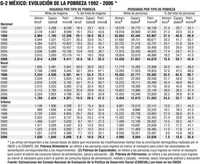 Pobreza Alimentaria.- En este caso extremo en que el ingreso no alcanza a cubrir ni los requerimientos básicos de alimentación, en 1996 se encontraban 34.7 millones de personas (37.4% de la población) y para 2006 ya sólo 14.4 millones (13.8%). En pesos, esta línea de pobreza era en 2006 de 599 pesos o menos por persona al mes en el ámbito rural y de 810 pesos en el urbano.