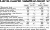 Las recientes proyecciones internas para la economía mexicana (cierre 2007 y 2008) son las del gobierno federal (Presupuesto 2008, septitmbre), las del Banco de México (B de M, octubre), y la encuesta del mismo Banxico a grupos de analistas del sector privado (septiembre), con los siguientes pronósticos principales: