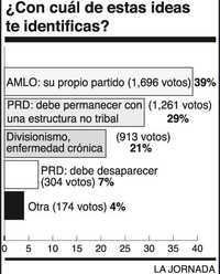 Esta semana hizo crisis la división de la izquierda: AMLO llamó a los legisladores a no apoyar la reforma electoral; éstos se separaron entre los que sí negociarán con el panpriísmo y los que acatarán la línea del Peje; también hubo una convocatoria para que López Obrador forme su propio partido, recibió su instantáneo rechazo. En medio de esta situación hicimos nuestro sondeo sobre el destino de la izquierda mexicana. Participaron 4 mil 348 personas. El 39 por ciento opina que el ex aspirante presidencial debe crear su propio partido; 29 por ciento se pronunció porque el PRD permanezca pero con una estructura no tribal; el 21 por ciento asumió una posición resignada y filosófica: el divisionismo es la enfermedad crónica de la izquierda y, por último, un 7 por ciento votó por la desaparición del PRD y su remplazo con un partido renovado.