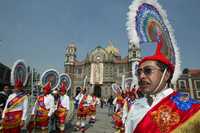 Arriba, en la sede de la Asamblea Legislativa ultiman detalles del montaje de una exposición de arte guadalupano. Abajo, continúa la llegada de peregrinos a la Basílica de Guadalupe; al cierre de la edición se calculaba el arribo de casi 400 mil personas al templo mariano