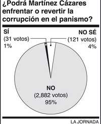 ¿Fue democrática la elección de Germán Martínez Cázares como presidente del PAN? Noventa y dos por ciento de las 3 mil 34 personas que encuestamos esta semana opinó que no. Fue un dedazo del presidente Calderón al más refinado estilo priísta. ¿Podrá, desde su partido, enfrentar, y revertir, la corrupción que se ha ido apoderando de los gobiernos panistas? Noventa y cinco por ciento de los encuestados respondió que tampoco. Hay un antecedente que no lo favorece: como secretario de la Función Pública exoneró sin investigación previa a la familia Fox de los presuntos delitos que cometió. El blanquiazul ha venido a clonar el fenómeno de corrupción gubernamental que prometió erradicar.