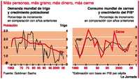 Dos cosas, de hecho. Una es la creciente riqueza en China e India. Riqueza que nutre la demanda de carne, lo que a su vez aumenta la demanda de cereales para alimentar ganado. El uso de granos para pan, tortillas y chapatis está vinculado al crecimiento de la población del mundo. Durante décadas ha sido uniforme, reflejando la desaceleración del aumento de la población. Pero la demanda de carne se vincula al crecimiento económico (ver gráfica) y, por quinto año consecutivo, el PIB global muestra una tasa de expansión de más de 4%.