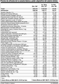 En el primer año de gobierno de Felipe Calderón, la canasta básica del mexicano –integrada por 42 alimentos y productos de limpieza e higiene personal– ha subido de precio en 35 por ciento. Así, mientras en diciembre de 2006 una familia requería 818.44 pesos para su adquisición, hoy debe gastar para los mismos artículos mil 103.63 pesos.