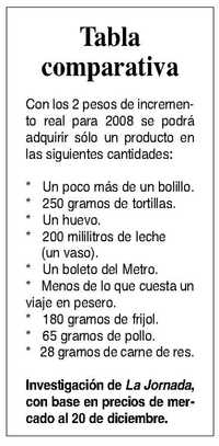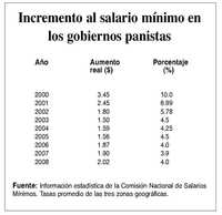 El alza anunciado por la Comisión Nacional de Salarios Mínimos (CNSM) es apenas 12 centavos mayor al otorgado para 2007, el cual fue de 1.90 pesos. Incluso, el representante de la Coparmex, Tomás Natividad, dijo sin inmutarse que “sería ilusorio pensar que este aumento va a recuperar el poder adquisitivo”, mientras, resignado, Adolfo Gott, quien llevó la voz de los sindicatos en esta negociación, aceptó que “es raquítico y ni modo, significa un sacrificio más para los trabajadores”, pero de lo contrario “se ponen en peligro los empleos”.