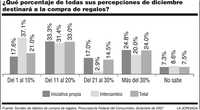Más de la tercera parte de los mexicanos que acostumbran dar regalos en la temporada navideña gasta entre 11 y 20 por ciento de sus percepciones de fin de año en comprarlos, en tanto que 24 por ciento destina un tercio de sus ingresos a ese fin, revela un sondeo sobre hábitos de compra realizado por la Procuraduría Federal del Consumidor (Profeco).