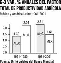 “Asímismo, el Factor Total de Productividad (FTP) agrícola (que mide básicamente el impacto de mejoras tecnológicas) aumentó en América Latina y el Caribe de 1.39% anual en el periodo 1961-1980 a 2.31% entre 1981 y 2001, mientras que en México, al contrario, disminuyó de 2.26% (1961-1980) a 1.51% en 1981-2001 (Gráfico 3).