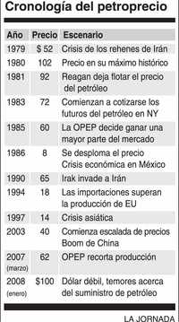Aunque la mayoría de los medios dirán hoy que el precio del petróleo rompió todos los récords al alcanzar los 100 dólares por barril –fue una sola operación, luego retrocedió–, lo cierto es que todavía está atrás de la marca de abril de 1980, cuando llegó a 102.81 –si ajustamos los precios nominales a la inflación. Estadística aparte, los efectos en Estados Unidos y en México se dejarán sentir fatalmente. Nuestra economía es satélite de la vecina, además de que 20 millones de mexicanos viven de aquel lado y son la principal fuente de divisas del país, inclusive arriba de Petróleos Mexicanos. La Bolsa Mexicana de Valores sufrió ayer un revés, pero no debe asustarnos: sólo concierne a un pequeño grupo de millonarios nacionales y extranjeros. Las caídas de la bolsa no repercuten en la economía familiar, como tampoco las subidas, ya ven ustedes que aunque nuestros ricos ganen miles de millones de dólares no suben los sueldos ni las prestaciones. ¿Entonces, qué es lo que hay que temer? Los expertos del gobierno ubicarán el origen de nuestros problemas en los fenómenos internacionales, lo cual es cierto, pero sólo en parte. Son factores internos los que determinarán otro año malo para la economía de las pequeñas empresas y las familias mexicanas.