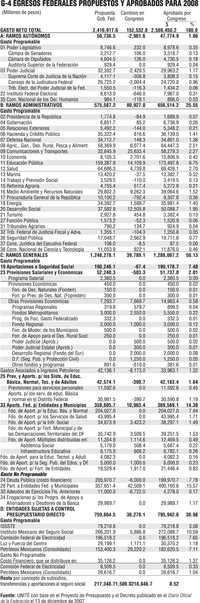 Empatando con la captación de recursos prevista en la Ley de Ingresos, el Presupuesto de Egresos de la Federación para 2008 fue aprobado por el Conreso en 2 billones 569 mil millones de pesos (Gráfico 4).