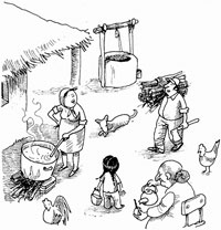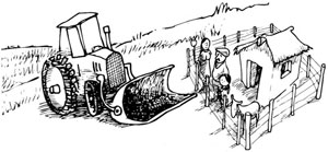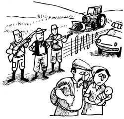 “La gente del margen izquierdo quedó con las manos cortadas, porque se llevaron toda el agua para la margen derecha”, lamentan. Y es que al canal de tierra sólo llega el líquido cada tres meses y mucho se pierde porque no está revestido, de modo que los campesinos que a pesar de todo decidieron quedarse tuvieron que cambiar de vida: trabajan a jornal, algunos hacen leña y carbón, otros tienen hornos de tabique y la mayoría atiende rebaños de chivas para vender cabritos y quesillo, pero la poca agua que llega y se embalsa no alcanza para nada y los animales se malpasan y mueren. Los campesinos reclamaban, pero los responsables provinciales de la administración del agua no les hacían caso: “Nos ignoraban. Y por ahí si nos atendían, quizá tampoco nos escuchaban”, comentan. Hasta que en 2002 los parceleros del margen derecho vaciaron completamente el dique dejando sin una gota de agua a los campesinos. Y la paciencia se acabó. Apoyados por la Apenoc, los de la orilla izquierda se organizaron en una Asamblea del Agua y decidieron hacer un corte de carretera en Paso Viejo y tomar el dique. Y no se movieron hasta que llegó el funcionario de gobierno responsable de la situación. Gracias a la acción, ahora el agua les llega cada mes de modo que en los últimos años los de la orilla izquierda han hecho siembra. Además, a fines de 2007, lograron que se les entregaran dos parcelas del margen derecho, tierra que han tenido que defender cuerpo a cuerpo, pues golpeadores de los latifundistas quisieron recuperarlas. Y al cosechar, a los de Pichanas se les ilumina la cara. No sólo a Ismael Sánchez y “Pipo” Ramos, hombres mayores que aún se acuerdan de la última gran cosecha de garbanzo hace 30 años, también a los niños y jóvenes que entonces no habían nacido y no sabían lo que es cultivar y cosechar su propia comida. Los hombres y las mujeres de la orilla izquierda conmueven y son admirables por su indoblegable perseverancia, por su terca decisión de seguir siendo campesinos en tierra de agronegocios. ¿Por qué –les pregunto– aguantaron casi 30 años en este erial y pastoreando cabras que se les morían de sed? La respuesta es desarmante: “Es que nos gusta este modo de vivir, sin nadie que te mande.” *Los dibujos son de Carlos Julio, cura y monero, cuyo evangelio de las viñetas ilumina cientos de carteles, volantes, trípticos, periódicos y folletos campesinos “El grito que nos mueve” “Resistimos contra las grandes empresas que alambran nuestros campos, desalojan las familias, acaparan los bienes naturales y guardan su plata en bancos extranjeros. Las mismas grandes empresas que contaminan ríos, trabajan a cielo abierto llevándose nuestros minerales e intoxican cielos fumigando.” Movimiento Nacional Campesino Indígena. Vía Campesina El boom de la soja