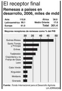 El total de los flujos globales es discutible. El BM habla de 240 mil mdd por año, mientras un informe reciente del Fondo Internacional de la ONU para el Desarrollo Agrícola (IFAD, por sus siglas en inglés) afirmaba que 300 mil mdd fueron a dar a países pobres en 2006. Tomando en cuenta pagos en especie y el efectivo transportado por viajeros, quizás una de cada 10 personas en el planeta se beneficia de las remesas.