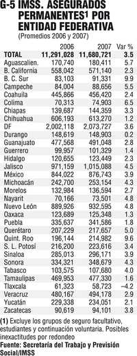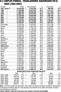 Si en vez del promedio anual de asegurados se utilizan las cifras diciembre-diciembre para comparación, tenemos que en el último mes de 2007 los trabajadores asegurados en el IMSS ascendieron a 14 millones 875 mil personas, 794 mil (5.6%) más que en diciembre de 2006. Del total de asegurados en este último mes, 79.5% eran permanentes y 20.5 eventuales.