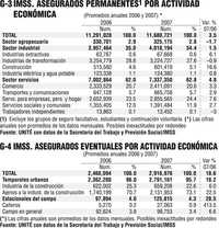 De los 11 millones 681 mil asegurados permanentes promedio en 2007, sólo 325 mil (1.7% menos que en 2006) trabajaban en el sector agropecuario; 4 millones 18 mil (1.5% más que en 2006) en el sector industrial; y 7 millones 337 mil (4.8% más que en 2006) en el sector servicios (Gráfico 3).
