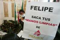 Poco a poco, en los palcos comenzaron a surgir cartulinas con consignas que iban desde la exigencia “Felipe saca tus manos limpias de Pemex” hasta el recordar que “Pemex nos costó a todos”. Mientras, frente a la tribuna, media docena de jóvenes desplegaban dos mantas.