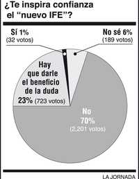 Sólo uno por ciento de los 3 mil 145 participantes de nuestra encuesta de esta semana opina que sí le inspira confianza el nuevo Instituto Federal Electoral que preside Leonardo Valdés Zurita. Veintitrés por ciento dice que hay que darle el beneficio de la duda. Pero 70 por ciento cree que no recuperará la confianza ni la credibilidad de la ciudadanía.