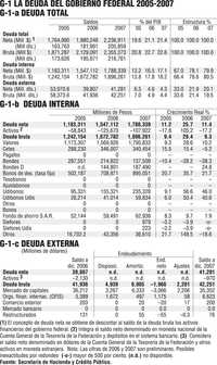 Al cierre de 2007 el saldo de la deuda bruta (lo que debe el gobierno federal interna y externamente) se ubicó en 2 billones 355 mil pesos (216 mil 761 millones de dólares), cifra equivalente a 22.6% del PIB. De esta deuda 80.5% es considerada interna y 19.5% externa. Su aumento respecto al año anterior (2006) fue 10.6% en pesos corrientes y 10.8% en dólares (Gráfico 1-a).