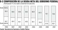 La deuda neta (deuda bruta menos los activos financieros que el gobierno federal tiene depositados a su favor) ascendió a 2 billones 237 mil millones de pesos (205 mil 860 millones de dólares), equivalentes a 21.4% del PIB. De esta deuda neta, 79.9% es considerada interna y 20.1% externa, porcentajes que continúan con la tendencia gubernamental de financiarse cada vez más con emisiones internas que externas (Gráfico 2) para su deuda documentada como tal (con la apertura financiera, muchos valores gubernamentales emitidos en México están ahora en manos de inversionistas extranjeros y son por ello, en sentido estricto, deuda con el exterior). Esta deuda neta del gobierno federal aumentó en 2007 a una tasa 13.0% en pesos corrientes y 13.1% en dólares.