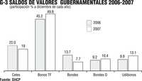 De los valores gubernamentales, va en descenso el saldo de las emisiones de Cetes (-5.2% en 2007) y Bondes (-38.3%), mientras que aumenta el saldo de los Bondes D (24.8%), Udibonos (46.0%), y de los Bonos de Desarrollo a tasa fija (21.7%). Estos últimos son los de mayor cuantía y representan la mitad de los valores en circulación (Gráfico 3).