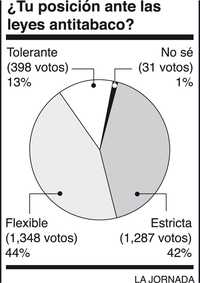 En un sondeo que abarcó a 3 mil 64 personas de diversas ciudades del país, mil 226 dijeron que no fuman, 766 sí fuman, 705 ya dejaron el tabaco y 367, aunque no son adictas, conviven con fumadores. En relación con las leyes antitabaco aprobadas por las cámaras de Diputados y Senadores, para su aplicación en toda la República, y la ley autorizada por la Asamblea Legislativa para ser ejecutada exclusivamente en el Distrito Federal, expresaron distintas posiciones. Estricta: no permitir fumar en lugares públicos cerrados, mil 287 personas. Flexible: crear lugares apartados para los fumadores, mil 348. Tolerante: no les molesta que la gente fume, las cosas pueden seguir como hasta hoy: 398.