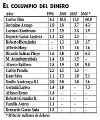 En la lista de multimillonarios que dio a conocer ayer la revista Forbes hay cambios importantes. Ya no aparece la única mujer, Marisún Aramburuzabala, esposa del embajador de Estados Unidos, Tony Garza. En cambio, los empresarios dedicados a la minería Alberto Bailleres –el rey de la plata– y Germán Larrea muestran progresos impresionantes. También aumentó la fortuna del principal accionista de TvAzteca, Ricardo Salinas Pliego. Y Carlos Peralta, el heredero de don Alejo –alguna vez el hombre más rico de México después de Carlos Slim– no figura. El dinero se concentra más en menos manos. (Ver gráfica arriba).