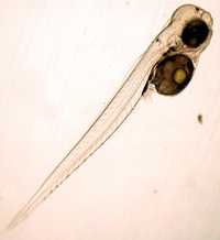 Científicos de la Universidad James Cook y del Instituto de Ciencia Marina, de Australia, afirman que el cambio climático puede estar causando que los peces de arrecife se pierdan y sean incapaces de regresar a las áreas de desove, lo que tendría graves consecuencias para la supervivencia de esos ecosistemas. Arriba, imagen microscópica de huevos de pez antes de ser implantados. La otra gráfica corresponde a una larva con los otolitos visibles entre las dos áreas oscuras