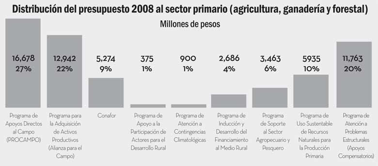 En detrimento de instrumentos orientados a la conservación y manejo campesino e industrialización de bosques nativos, el presupuesto federal de la Comisión Nacional Forestal (Conafor) de 2008 fortaleció significativamente las asignaciones de los programas para siembra de árboles y para las llamadas plantaciones forestales comerciales (PFC). De esta forma, aunque el presupuesto forestal crece, se soslaya el hecho de que el propio Ejecutivo ha declarado a los bosques y selvas como asunto de seguridad nacional. Los recursos públicos disponibles apenas sirven para apoyar 13 por ciento de los 56 millones de hectáreas de bosques y selvas nativos del país. Los programas de conservación, reforestación y manejo de los ecosistemas forestales deben fortalecerse para generar no sólo beneficios a las poblaciones de estas regiones, sino también para detener los altos índices de deforestación causados por los estímulos que desde el aparato público se dan a la agricultura y la ganadería. Un análisis del PEF forestal. El Presupuesto de Egresos de la Federación (PEF) 2008 implica para la Conafor un recurso récord de 6 mil 44.7 millones de pesos, 35.3 por ciento más que en 2007 en términos nominales. El principal recurso de la Conafor se aplica al ProÁrbol (Bosques recuperados, protegidos y productivos), con 5 mil 549.2 millones de pesos este año. Allí están los principales programas de la dependencia, y destacan tres, que absorben 61.5 por ciento del recurso, y que son los que la política pública está fortaleciendo: Se trata del Programa de Conservación y Restauración de Ecosistemas Forestales (Procoref), que en 2007 tuvo la encomienda de sembrar 250 millones de árboles con un presupuesto de mil 410 millones de pesos, y que ahora se incrementa en 381.8 millones (27.1 por ciento) a mil 792 millones. Este Procoref, que es seriamente cuestionado pues oficialmente se conoce que la sobrevivencia de los árboles plantados no rebasa 50 por ciento –y versiones de especialistas hablan de sólo 10 por ciento–, se complementa con el Programa de Manejo de Germoplasma y Producción de Planta, que contradictoriamente registra en 2008 una reducción de 3 por ciento en su asignación, de 737.9 millones de pesos. Por último, está el Programa de Plantaciones Forestales Comerciales (Prodeplan), que este año ejercerá 884.5 millones de pesos, 82.7 por ciento más que los 400.4 millones de 2007. Prodefor, en declive. Dentro del ProÁrbol, el instrumento que se debilita, y cuya misión es mejorar las capacidades campesinas de manejo de los ecosistemas y la conservación de éstos, es el Programa de Desarrollo Forestal (Prodefor), el cual se reduce en 5 por ciento para sumar 656.2 millones de pesos este 2008. El Programa de la Producción y Productividad de los Ecosistemas Forestales de Manera Sustentable (Procymaf), que tiene esos mismos propósitos, registra en 2008 un incremento de 26.7 millones de pesos (39.4 por ciento) respecto del año anterior, para sumar un recurso limitado de 94.7 millones de pesos.