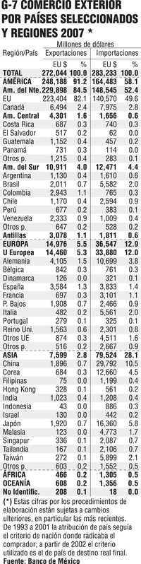Por países y regiones de origen y destino de nuestro comercio exterior, a Estados Unidos fueron, en 2007, 82.1% de nuestras exportaciones de mercancías y de ahí provinieron 49.6% de nuestras importaciones. A Europa sólo le vendemos 5.5%, pero le compramos 12.9%. Con Asia el desbalance es peor, pues sólo 2.8% de las exportaciones van a ese mercado (0.7% a China), pero de ahí proviene 28.1% de nuestras importaciones (10.5% de China) (Gráfico 7).