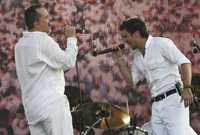 Miguel Bosé actúa al lado de Juanes; abajo, la multitud en el puente que une a Colombia con Venezuela