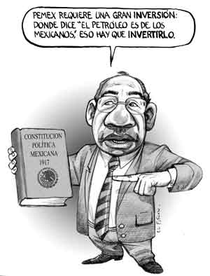 Empero, no se trata sólo de eso. La colosal corrupción en medio de la cual se hacen esos arreglos nos puede colocar en situación de perderlo todo y de enriquecer a unos cuantos vivales que sólo buscan el interés particular. Hoy, por lo menos, tenemos una ventaja respecto al pasado: se requiere cambiar nuestro régimen jurídico y eso lo podemos hacer sólo nosotros, sin olvidar que entre nosotros están los que desean enriquecerse a costa de perder nuestro patrimonio nacional. Nos dicen que no se tocará la Constitución. Como lo muestra el colega Almazán, bastan leyes secundarias para anular el régimen constitucional del subsuelo y eso se viene haciendo desde hace casi sesenta años. Eso es lo que los panistas y muchísimos priístas buscan. Sólo se lavan la cara para ocultar el enorme latrocinio que están bramando por cometer. ARTICULO 27. LA PROPIEDAD DE LAS TIERRAS Y AGUAS COMPRENDIDAS DENTRO DE LOS LIMITES DEL TERRITORIO NACIONAL, CORRESPONDE ORIGINARIAMENTE A LA NACION, LA CUAL HA TENIDO Y TIENE EL DERECHO DE TRANSMITIR EL DOMINIO DE ELLAS A LOS PARTICULARES, CONSTITUYENDO LA PROPIEDAD PRIVADA. (REFORMADO MEDIANTE DECRETO PUBLICADO EN EL DIARIO OFICIAL DE LA FEDERACION EL 10 DE ENERO DE 1934) Parrafo 4.- CORRESPONDE A LA NACION EL DOMINIO DIRECTO DE TODOS LOS RECURSOS NATURALES DE LA PLATAFORMA CONTINENTAL Y LOS ZOCALOS SUBMARINOS DE LAS ISLAS; DE TODOS LOS MINERALES O SUBSTANCIAS QUE EN VETAS, MANTOS, MASAS O YACIMIENTOS, CONSTITUYAN DEPOSITOS CUYA NATURALEZA SEA DISTINTA DE LOS COMPONENTES DE LOS TERRENOS, TALES COMO LOS MINERALES DE LOS QUE SE EXTRAIGAN METALES Y METALOIDES UTILIZADOS EN LA INDUSTRIA; LOS YACIMIENTOS DE PIEDRAS PRECIOSAS, DE SAL DE GEMA Y LAS SALINAS FORMADAS DIRECTAMENTE POR LAS AGUAS MARINAS; LOS PRODUCTOS DERIVADOS DE LA DESCOMPOSICION DE LAS ROCAS, CUANDO SU EXPLOTACION NECESITE TRABAJOS SUBTERRANEOS; LOS YACIMIENTOS MINERALES U ORGANICOS DE MATERIAS SUSCEPTIBLES DE SER UTILIZADAS COMO FERTILIZANTES; LOS COMBUSTIBLES MINERALES SOLIDOS; EL PETRÓLEO Y TODOS LOS CARBUROS DE HIDROGENO SOLIDOS, LIQUIDOS O GASEOSOS; Y EL ESPACIO SITUADO SOBRE EL TERRITORIO NACIONAL, EN LA EXTENSION Y TERMINOS QUE FIJE EL DERECHO INTERNACIONAL. |