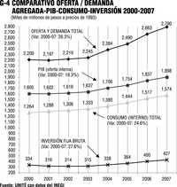 En el periodo 2000-2007, la Oferta y la Demanda totales aumentaron 26.3%; el PIB (la oferta interna de bienes y servicios) sólo 18.3%; el Consumo interno 24.6, y la Inversión Fija 27.6, un crecimiento que podría ser aceptable si no se diera en niveles muy bajos en relación a los requerimientos del país (Gráfico 4).