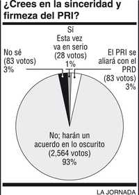 Los principales líderes del PRI en las cámaras de Diputados y Senadores se han pronunciado en contra de la privatización de Pemex. Sin embargo, 93 por ciento de las personas que encuestamos esta semana en distintas ciudades de la República no cree en la firmeza y sinceridad de su posición, y opina que terminarán negociando ‘en lo oscurito’ con el PAN; están en pleno regateo para vender caro su apoyo. El 3 por ciento piensa que el PRI podría aliarse con el PRD en la defensa de la paraestatal y sólo uno por ciento cree que los líderes priístas sostendrán su discurso antiprivatizador.