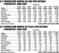 La producción minerometalúrgica de oro (que incluye la extracción, beneficio, fundición y afinación del metal) totalizó 39.4 toneladas en 2007, y la de plata, 2 mil 311 toneladas (Gráfico 1).