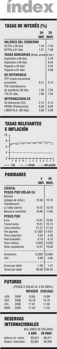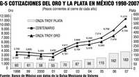 En cuanto a su cotización de mercado, tanto el oro como la plata mantuvieron en 2007 su marcado aumento de precios. El Centenario de oro pasó de 3 mil 400 pesos (corrientes) en 2001 a 11 mil 410 en 2007 (llegó a 13 mil 653 el 14 de marzo pasado y cerró el mes a 12 mil 523 pesos); la onza troy de oro de 2 mil 640 pesos a 9 mil 700 (y a 10 mil 533 al cierre de marzo), y la onza troy de plata de 55 pesos en 2001, a 183 pesos en 2007 (y a 209 pesos en marzo) (Gráfico 5)