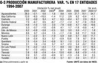 Según los índices de producción manufacturera que calcula el INEGI para 17 entidades (Gráfico 3), los estados con mayor crecimiento acumulado entre 2000 y 2007 son: Aguascalientes (54.7%), Puebla (31.9%) y Coahuila (26.3%).
