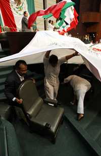 Diputados del Frente Amplio Progresista retiran la manta que cubrió por 16 días el recinto legislativo