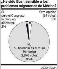 La opinión casi es unánime: el gobierno –ocho años consecutivos en la Casa Blanca– del presidente Bush, que concluirá el próximo noviembre, no fue ni remotamente positivo para México. En particular, en materia de migración resultó funesto. Como herencia queda el muro Fox-Bush a lo largo de la frontera. 95 por ciento de los encuestados de esta semana contestó con un rotundo no a la pregunta: ¿fue Bush sensible a las necesidades de los mexicanos en materia de migración? Sólo 2 por ciento dijo que el texano trató de hacer algo, pero el Congreso bloqueó sus iniciativas.