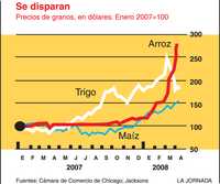 El año pasado los precios del trigo se elevaron 77%, y los del arroz, 16% (ver gráfica). Ha sido uno de los incrementos más agudos de precios de alimentos. Sin embargo, este año la velocidad se ha acelerado. De enero a la fecha, los precios del arroz se han elevado 141%; el de una variedad de trigo alcanzó 25% en un día. A 40 kilómetros de Abidjan, Mariam Kone, quien cultiva patatas, okra (quimbombó o ají turco) y maíz, pero alimenta a su familia con arroz importado, se lamenta: “el arroz es muy caro, pero no sabemos por qué”.