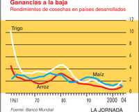 Esta disminución ha tenido un impacto lento e inevitable. Crear una nueva semilla se parece un poco a diseñar una vacuna contra la gripe: hay que estar al día, o los parásitos y la enfermedad anularán su eficacia. Cuando en 1966 se lanzó la variedad de arroz IR8, produjo casi 10 toneladas por hectárea; ahora apenas genera siete. Entre los años 60 y los 80, las cosechas de los principales granos aumentaron 3-6% anual en los países en desarrollo. Ahora el crecimiento anual bajó a 1-2%, por abajo del aumento de la demanda (ver gráfica). “Pagamos el precio de 15 años de negligencia”, dice Zeigler.
