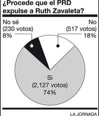 ¿Procede que el PRD expulse de sus filas a la diputada Ruth Zavaleta? Setenta y cuatro por ciento de 2 mil 874 personas que encuestamos esta semana opina que sí. El sondeo estuvo abierto a militantes y no militantes de ese partido; 18 por ciento sostiene la opinión contraria y 8 por ciento contestó que no sabe.