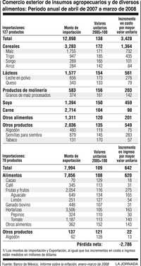 El incremento sostenido en el precio de 127 alimentos e insumos agropecuarios que importa México, provocó que el año pasado aumentara en 5 mil millones de dólares el costo de la factura por la compra de estos productos, una cifra que supera la totalidad de los recursos excedentes por exportaciones de crudo captados en 2007, reveló el Banco de México.